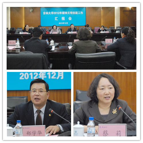 12月28日,长春市“高校文明杯”竞赛暨精神文明建设工作检查组来到吉林大学,对吉大2012年度精神文明创建活动进行检查验收。党委副书记蔡莉及学校精神文明建设工作相关部门负责人参加了汇报会。