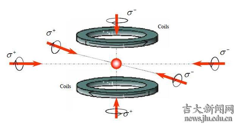 光场不仅具有能量,而且具有动量。激光冷却原子,从本质上讲是在原子与光子的动量交换过程中原子的动量被降低,从而降低原子的运动速度。实验中利用频率红移的两两对打的六束激光与热运动的原子相互作用。由于多普勒效应,运动的原子感受到迎面而来的激光频率升高而接近原子的共振频率,导致原子强烈吸收光子,然后通过自发辐射过程随机辐射光子。自发辐射的方向是随机的,平均来说自发辐射引起原子的动量变化是零,因此原子获得了所吸收光子的动量。原子感受到与其运动方向相反的作用力,原子的速度被减慢,从而到达冷却原子的效果。原子冷却后,仍然具有非常小的速率,不能被俘获在自由空间的某一特定区域。实验中利用一对反亥姆霍兹线圈在空间制造磁场梯度,由于塞曼效应使原子感受到与其位移方向相反的作用力,将原子俘获中磁场为零的中心区域,从而获得高密度的冷原子团。