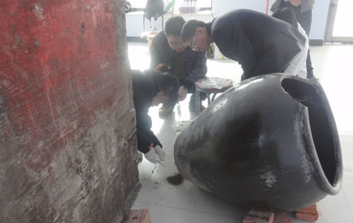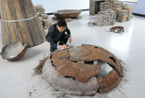 吉林大学考古专家冯恩学教授在测量酿酒器具——地锅