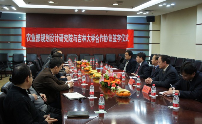 为贯彻落实教育部和农业部共建吉林大学的有关精神,发挥高等院校和科研单位合作优势,创建国家农业科技创新体系,促进吉林大学相关学科发展,12月8日下午吉林大学与农业部规划设计研究院(中国农业工程研究设计院)合作签字仪式在北京举行。校长展涛、常务副校长赵继及校办、生物与农业工程学院、农业部规划设计研究院等有关部门负责人参加了签字仪式。