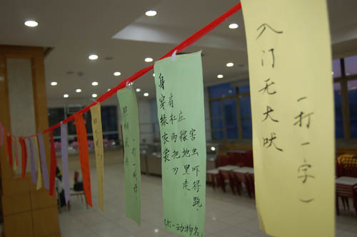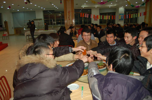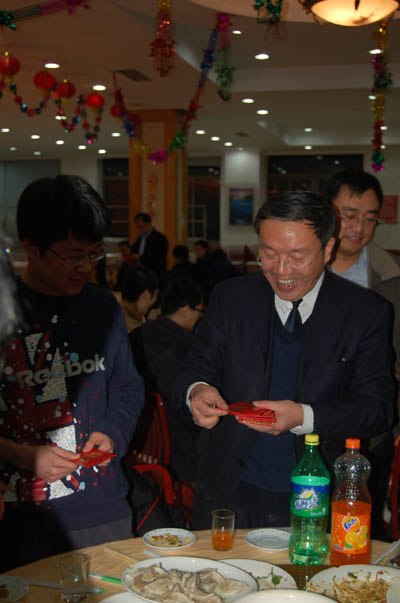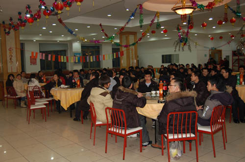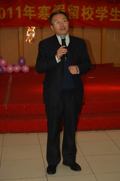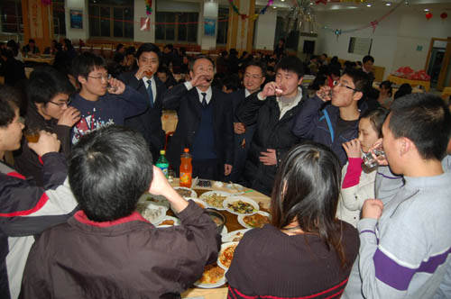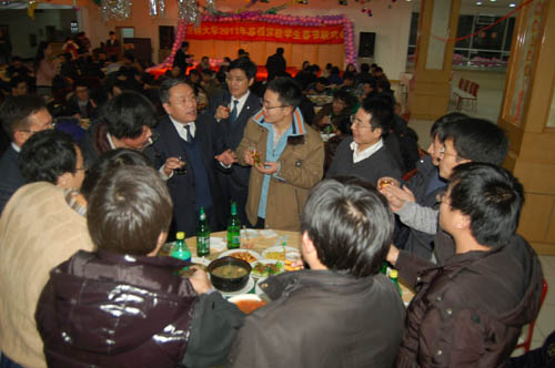 大红的灯笼,五彩的气球,装点得餐厅大堂分外喜庆。自合校以来,这已是韩晓峰第十一次和留校同学一起过年。“我代表陈德文书记、展涛校长向大家拜年” 韩晓峰祝福留校同学,“兔年到了,希望大家像兔子一样‘蹦’起来,在学习和工作上有跳跃式的发展。”他还叮嘱大家, “别忘了给远方亲友拜年”。
