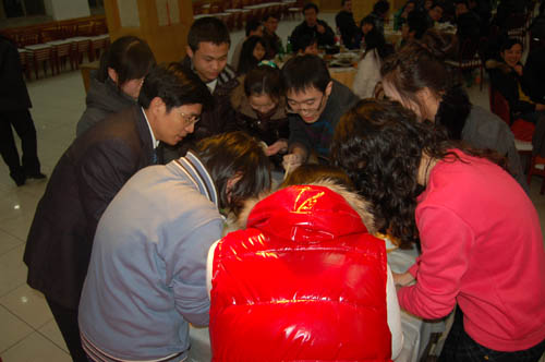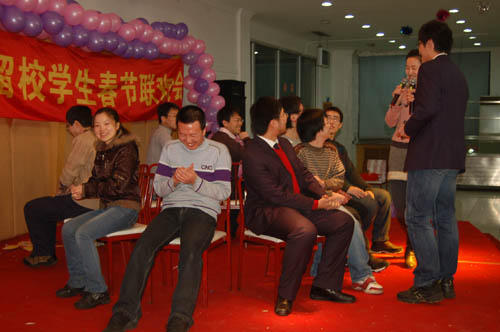 抢凳子、猜灯谜,一个个小游戏活跃了现场的气氛。韩晓峰更是亲自上阵,和研究生院常务副院长赵丁选各带一队,比赛包饺子。韩晓峰一边擀面皮,一边和身旁的同学交流,他的亲切让队友们倍感温馨。“谢谢书记陪我们过年!”艺术学院的同学也带来精彩的文艺节目,为年夜饭助兴。