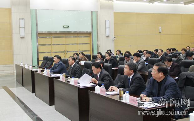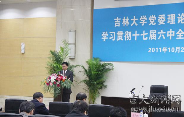 10月27日,吉林大学召开党委理论学习中心组扩大会议,学习贯彻十七届六中全会精神。校领导陈德文、王胜今、赵继、韩晓峰、张向东、刘晓民参加会议。党委常务副书记兼副校长王胜今主持会议。党委书记陈德文作重要讲话。