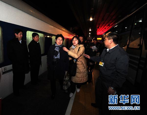 3月1日6时,来自吉林的全国政协委员乘坐Z62次列车抵达北京站,这是首批抵京参加全国政协十一届四次会议的京外委员。图为吉林大学迟宝荣委员(左三)在出站间隙接受中央人民广播电台记者刁莹采访。新华社记者 张铎 摄