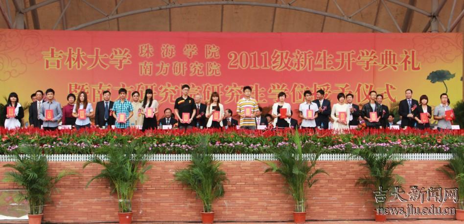 9月26日,吉林大学珠海学院、南方研究院举行新生开学典礼暨学位授予仪式,122名2011级新生获得珠海学院新生奖学金,南方研究院授予首个博士学位。校长李元元向大会发来贺信。原北京大学校长、中科院院士、吉林大学珠海学院董事会独立董事陈佳洱,吉林大学校领导陈德文、王胜今、赵继、吴振武及校研究生院、珠海学院等相关部门负责人出席开学典礼。