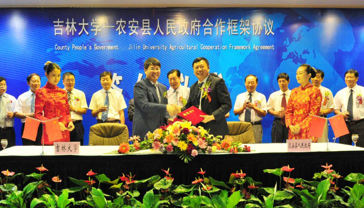 吉林大学校长展涛和与农安县人民政府县长王海英分别代表双方在协议上签字。
