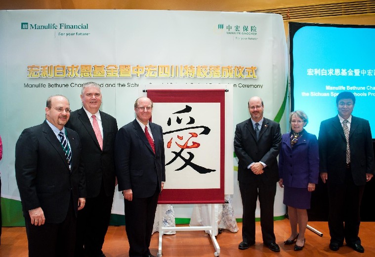 10月14日,“宏利白求恩基金暨中宏四川特校落成仪式”在上海世博会加拿大馆召开。吉林大学副校长王冠军、白求恩医学院党委书记屈英和等出席了仪式。仪式上,副校长王冠军与加拿大大使馆公使南杰瑞、宏利金融董事长Ms.Gail Cook-bennett、宏利金融总裁兼首席执行官邓广能等进行了亲切的交流,并共同书写中国字“爱”,标志着“宏利白求恩基金”的成立。