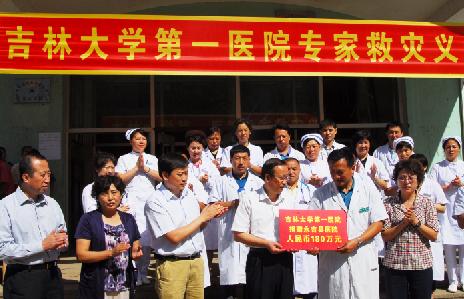 8月16日一早,由眼科、骨科、消化科、呼吸科、心内科、耳鼻喉科等8名专家组成的吉林大学白求恩第一医院救灾医疗队来到我省遭受严重洪灾的永吉县口前镇,对受灾百姓进行义诊,并向在洪灾中受到重创的永吉县医院捐助人民币180万元和40余种、价值3万余元的药品,使其能够尽快得到恢复重建,服务灾民。