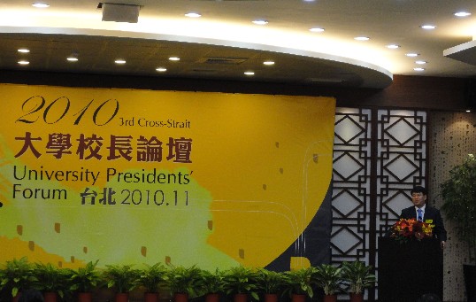在海峡两岸大学校长论坛中,展涛针对“全球化背景下,两岸高等教育的合作与发展”的论坛主题,建议在两岸签署ECFA的基础上,尽快签署高等教育交流合作协议,构建保障两岸高校合作的支撑体系,促进两岸高等教育合作的深层次发展,共同应对两岸社会发展过程中所面临的重大问题。在访问期间,展涛还会见了中国文化大学董事长张镜湖和校长吴万益、吉大客座教授江岷钦先生等台湾知名人士,并分别与吉大在台湾大学、政治大学、中国文化大学、淡江大学和义守大学的交流生进行了座谈,了解他们在台湾的学习和生活情况。座谈会上,同学们发言热烈,畅谈到达台湾之后的感受,并对交流院校的教学和管理方式以及对我校交流生的关怀和帮助给予了高度评价。展涛勉励他们努力学习,珍惜与台湾学生共同生活与学习的机会,并与在母校的同学分享在台学习的心得体会,成为联结两岸青年一代的友好使者。
