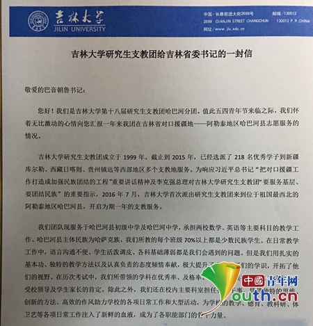吉林省委书记巴音朝鲁给吉林大学第18届研究生支教团哈巴河分团的同学们回信。吉林大学研究生支教团 供图