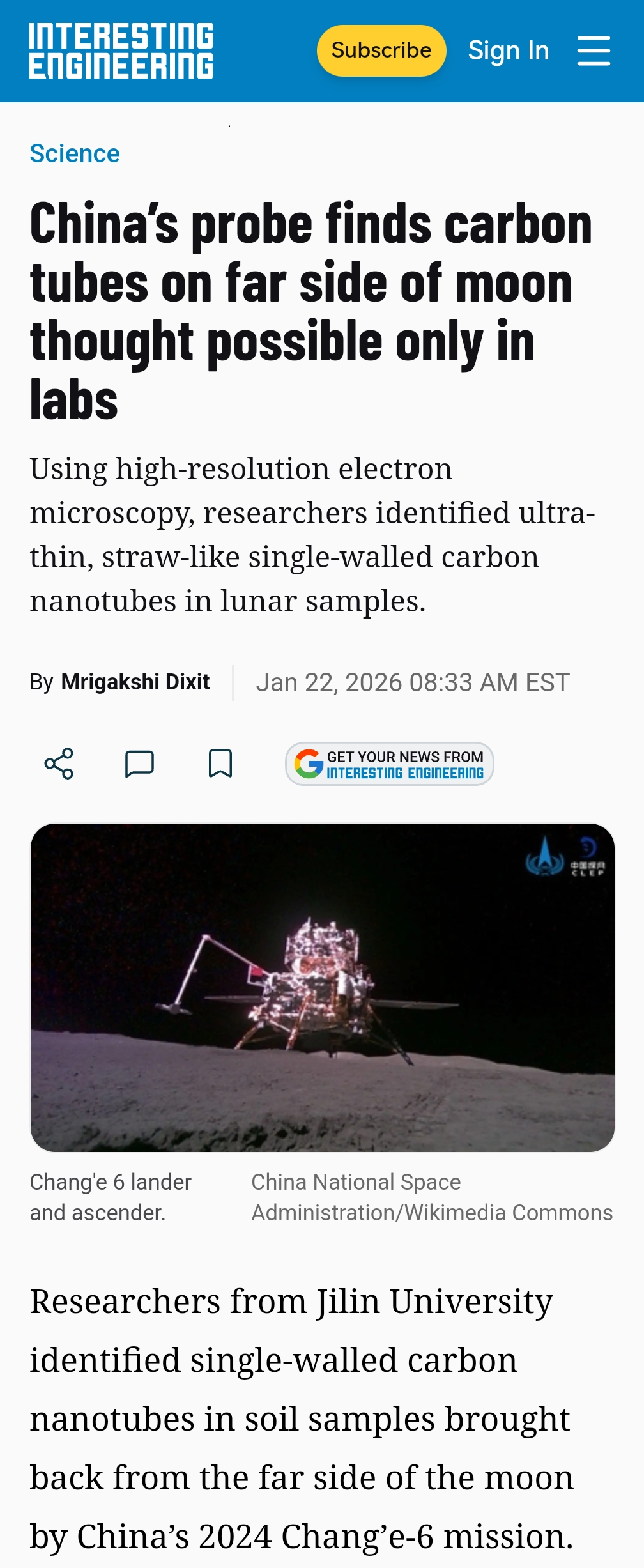【Interesting Engineering】Interesting Engineering近日报道,中国吉林大学团队在嫦娥六号从月球背面取回的土壤样本中,识别出天然形成的单壁碳纳米管结构。