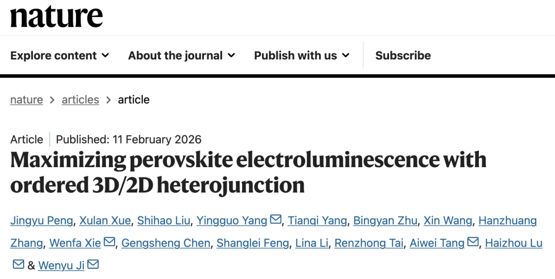 2026 年 2 月 11 日,吉林大学纪文宇、东南大学卢海洲、北京交通大学唐爱伟、吉林大学谢文法、复旦大学杨迎国作为共同通讯作者(吉林大学博士研究生彭镜宇、中国科学院长春光机所薛旭兰、吉林大学刘士浩作为共同第一作者),在国际顶尖学术期刊 Nature 上发表了题为:Maximizing perovskite electroluminescence with ordered 3D/2D heterojunction 的研究论文,在钙钛矿发光二极管(PeLED)发光界面调控及器件效率方面取得突破进展。