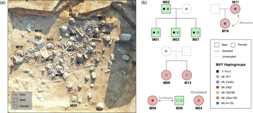 此外,考古学家在四台蒙古营遗址发现了居室葬的现象,通过古DNA亲缘关系鉴定,研究团队重建了埋藏在同一房址中的个体之间的家庭关系网络:其中包括一位父亲与他的三个亲生儿子、一对母女以及一对亲姐妹(图2)。这一发现为理解该遗址的社会结构提供了直接的生物学证据。