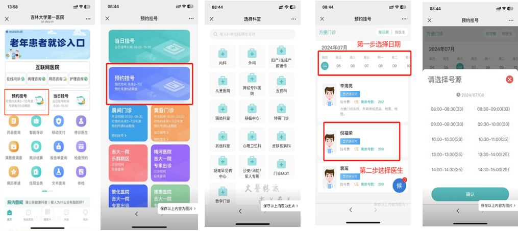 2.点击首页【预约挂号】,选择要预约的“科室”、“医生”及“时间段”。