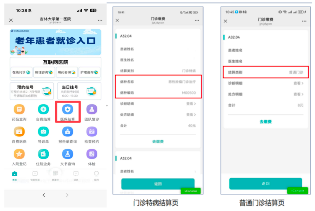 3. 进入吉林大学第一医院互联网医院公众号首页,点击【医保结算】进行结算。