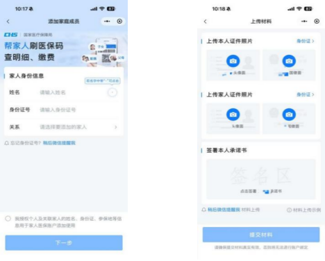2.点击【医保亲情账户】--【添加家人】--输入家人身份信息,上传证件照片,签署个人承诺书。