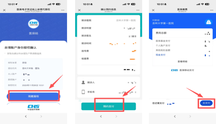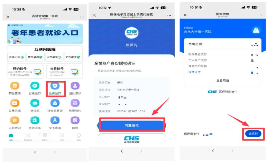 进入吉林大学第一医院互联网医院公众号首页,点击【医保结算】进行结算。对亲情账户身份授权,点击【同意授权】,确认支付信息,点击【去支付】完成支付。