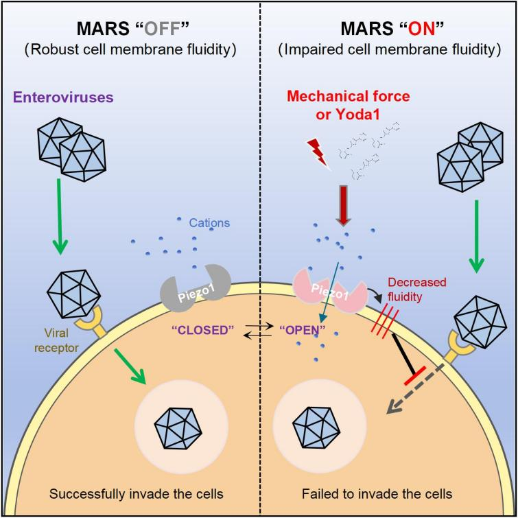 该研究首次定义机械力介导抗病毒反应系统(MARS),揭示了细胞通过感知机械力刺激激活Piezo1离子通道,进而诱导细胞膜重塑,在物理层面构建起一道阻挡病毒入侵的广谱防线。研究不仅阐明了这一不依赖干扰素的天然免疫新机制,也为抗病毒治疗提供了全新的“物理疗法”策略。