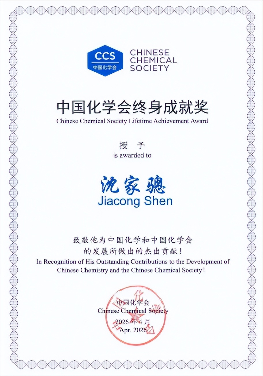 中国化学会终身成就奖是中国化学会面向中国化学工作者设立的最高奖项。此次沈家骢院士受多位专家推荐,经中国化学会奖励工作委员会评定,获评第五届中国化学会终身成就奖。这既是对他教育科研成就的高度肯定,更是吉林大学和吉林大学化学学科的光荣。