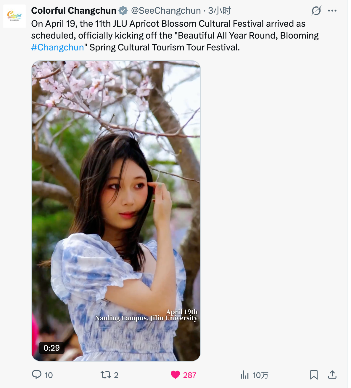【X平台】X平台多彩长春”发布吉林大学杏花文化节相关内容,获中国驻巴基斯坦大使馆文化参赞、巴基斯坦中国文化中心主任转推、点赞。