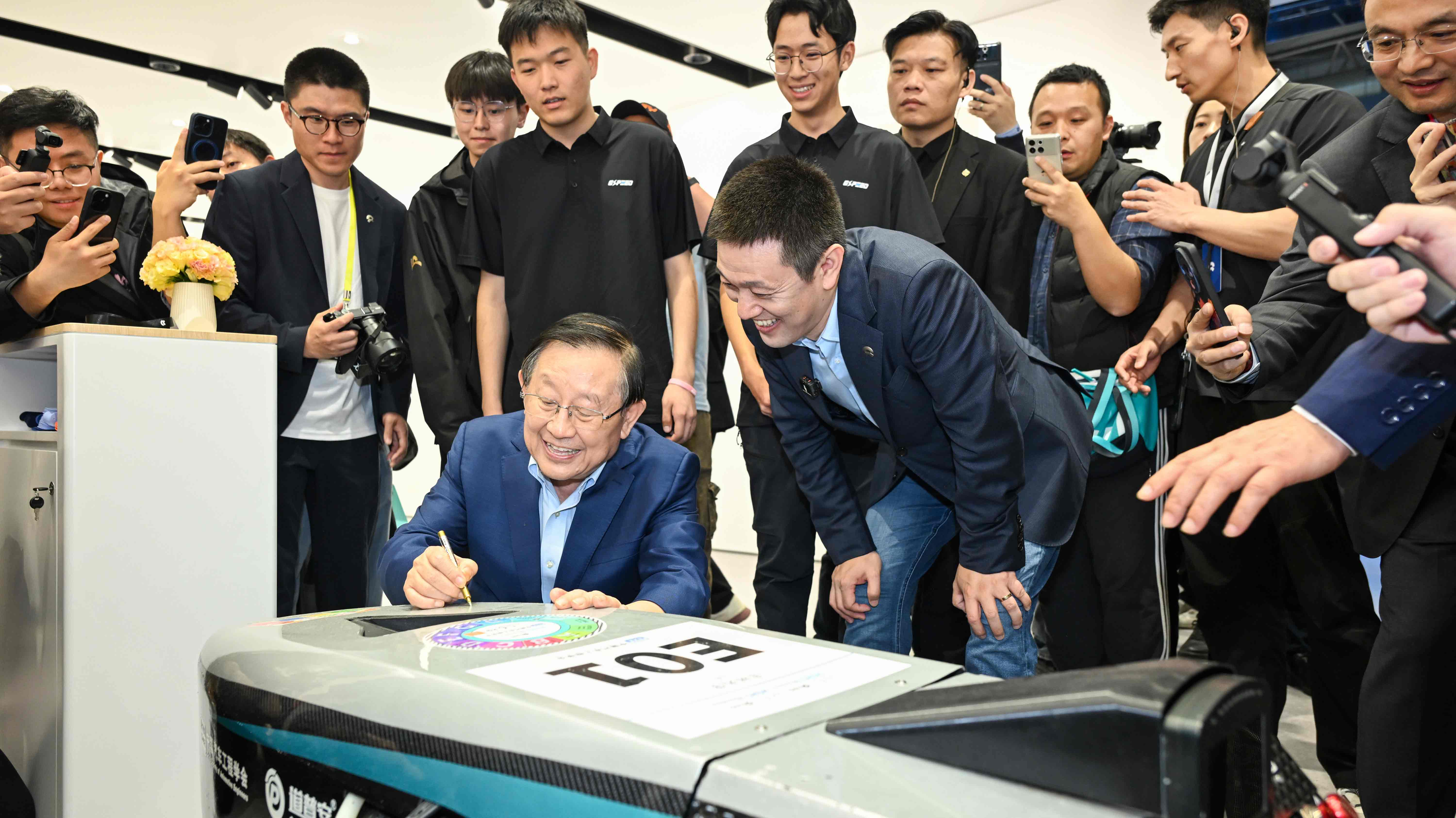 当天,中国科学技术协会主席万钢莅临蔚来展台,与2025中国大学生电动方程式大赛冠军车队——吉林大学电车队亲切交流,并在冠军赛车上签名寄语:“加电创未来”,表达了对青年创新人才的殷切期望与对赛事的高度认可。