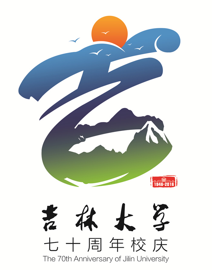 吉林大学70周年校庆徽标主体取形于中国书法“吉”字。背景色为白,主体色为金、蓝、绿、红。设计元素形意结合,源自校徽、校歌、校园建筑和吉大精神。