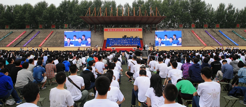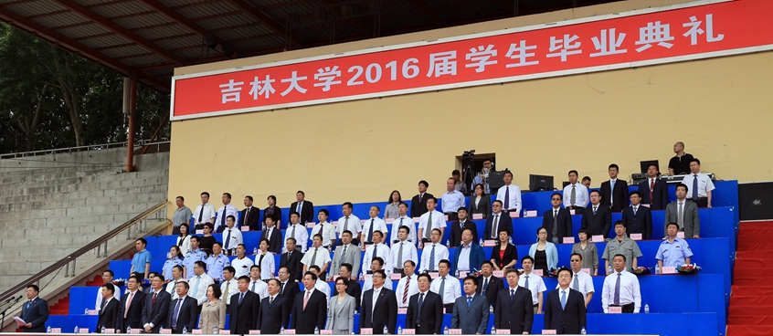 【本站记者 文/张雪 摄/方卫东 袁佳佳】6月25日,吉林大学在中心校区体育场隆重举行2016届学生毕业典礼,见证和欢送17848名毕业学子迈向社会,开启人生新的征程。校党委书记杨振斌,中国工程院院士、校长李元元,中科院院士、中国科学院长春应用化学研究所所长、吉大校友安立佳,中科院院士、吉大教授于吉红,校领导蔡莉、陈岗、韩晓峰、张向东、吴振武、李忠军、郑伟涛、孙友宏、王利锋,校长助理刘德斌,各学院、研究生培养单位负责人,校内相关职能部门负责人,教职工、校友、学生家长及毕业生代表参加典礼。典礼由常务副校长邴正主持。校园网同步直播。