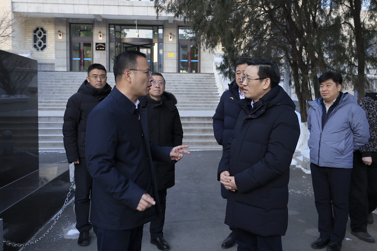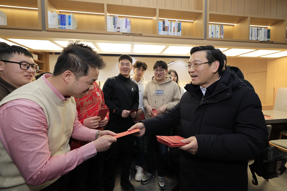 在图书馆法学馆,田辉听取图书馆安全管理和假期服务保障工作情况汇报。他强调,图书馆作为人员密集场所,藏书及古籍资料众多,必须时刻保持警惕,常态化开展安全隐患排查。要加强与保卫等部门的协同联动,确保发现问题能够第一时间有效快速处置。田辉与在图书馆学习的留校学生深入交流,细致询问同学们的学习与生活状况,认真征求对学校工作的意见建议,叮嘱大家合理规划假期,兼顾学习、生活与身体健康,度过快乐充实的春节。