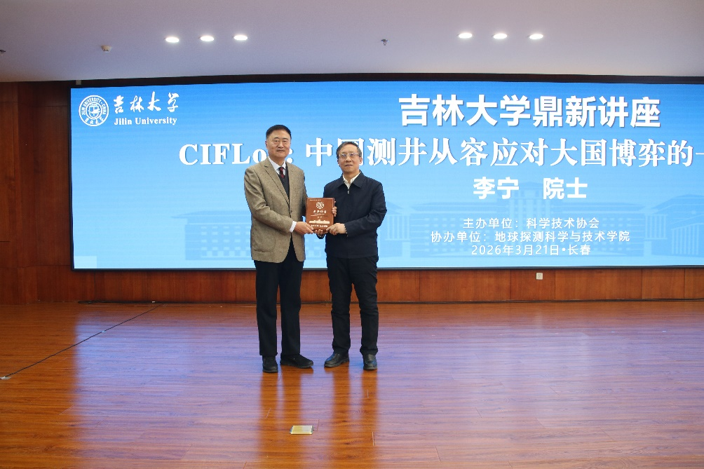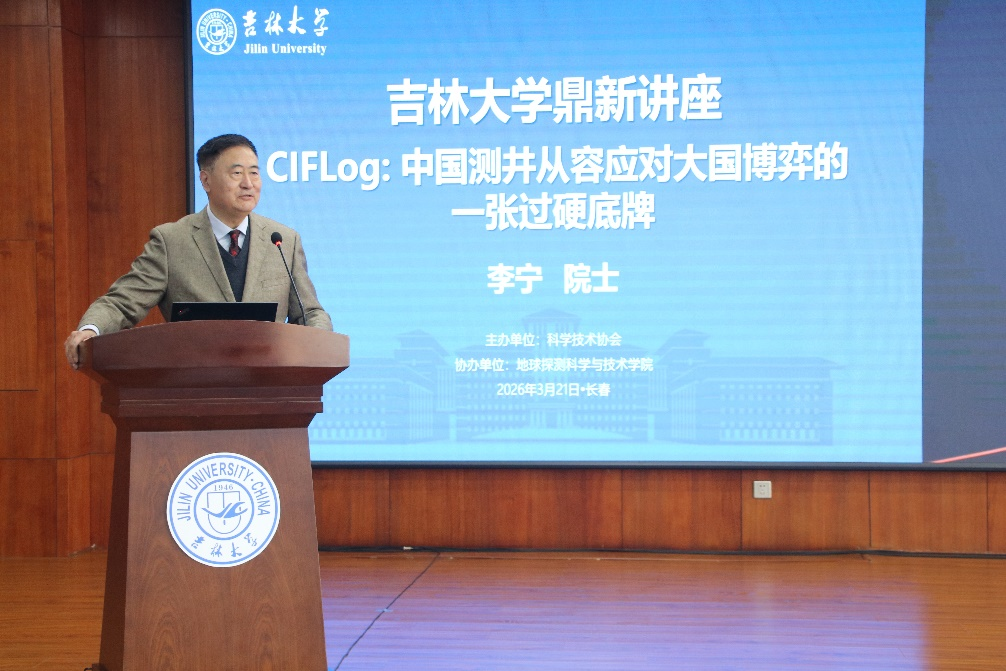 【供稿:地球探测科学与技术学院】3月21日下午,中国工程院院士、中国石油勘探开发研究院李宁教授做客吉林大学80周年校庆鼎新讲座,以“CIFLog:中国测井从容应对大国博弈的一张过硬底牌”为题作学术报告。中国工程院院士、吉林大学学术委员会主任委员、地球科学学部学部长林君教授,校党委常委、副校长边铁出席讲座。讲座由地球探测科学与技术学院院长冯晅主持。