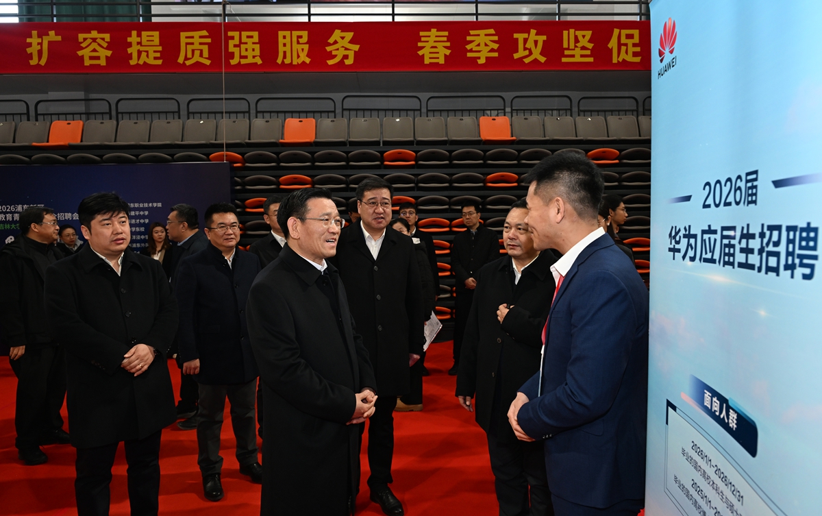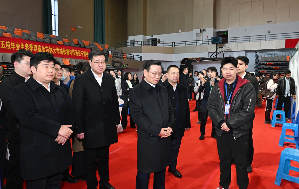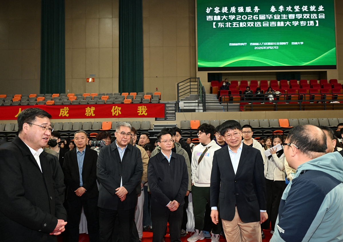 【文字/国帅 图片/方卫东】3月27日上午,2026年东北片区高校春季促就业攻坚行动暨东北五校毕业生春季双选会在吉林大学举行。校党委书记田辉、校长张希来到双选会现场调研指导,实地走访用人单位展位,与供需对接洽谈学院及毕业生代表亲切交流。