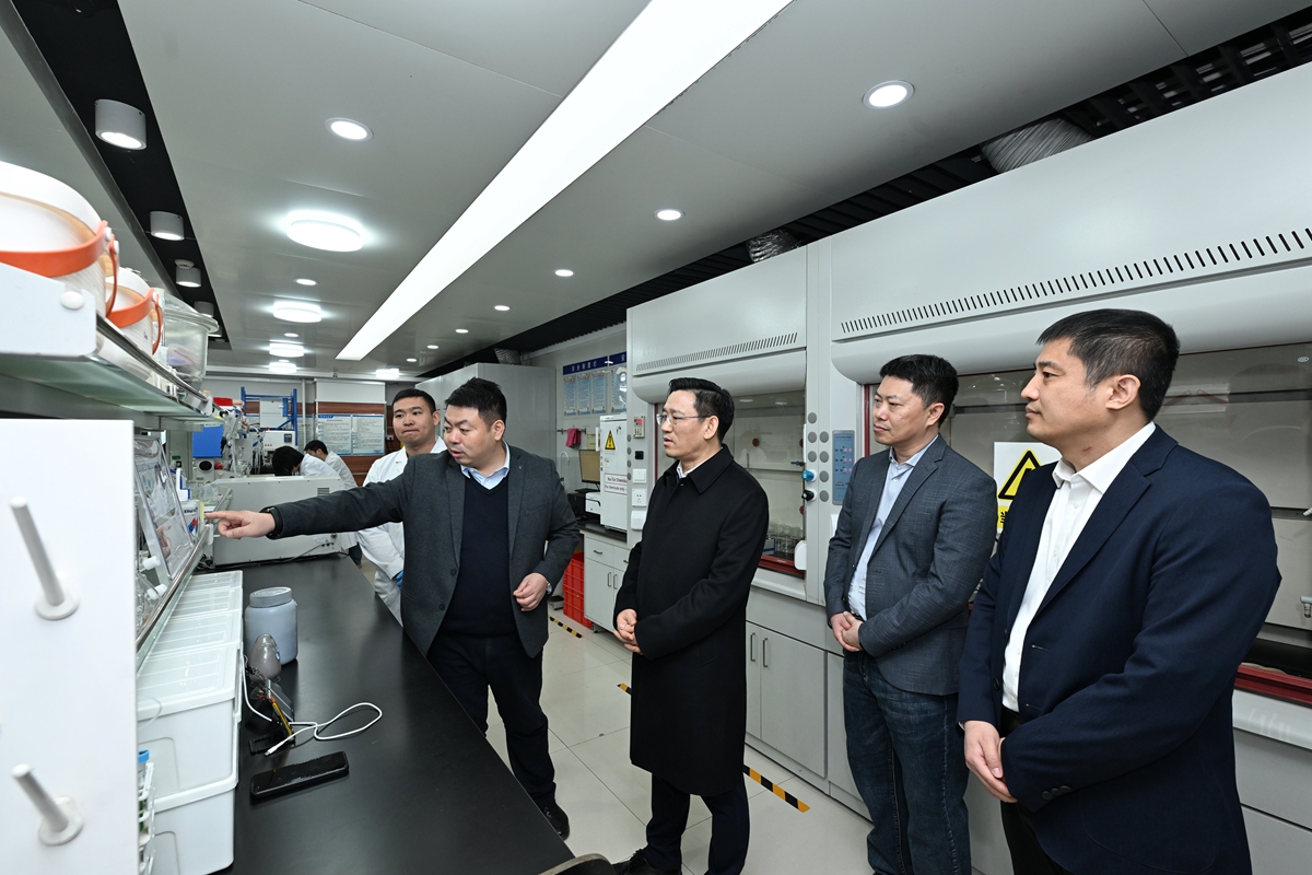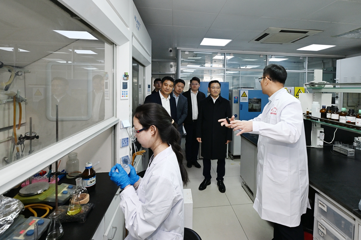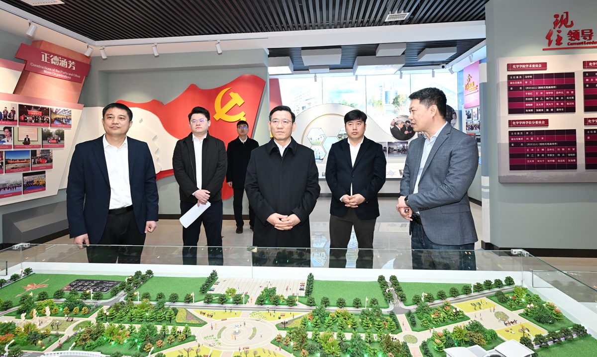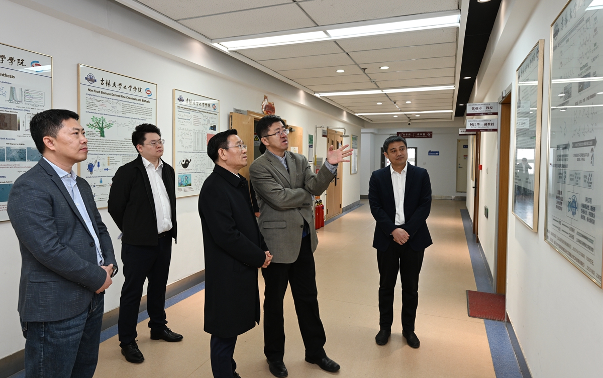 在化学学院,田辉实地考察院史馆、含硼有机功能材料实验室、高分子合成化学实验室、功能复合固体能源材料实验室,深入调研化学学科发展建设、科研成果转化、服务地方发展以及党建工作等情况。田辉指出,化学学院拥有深厚的历史积淀和坚实的学科基础,要进一步巩固和扩大传统优势,不断深化与其他学科的交叉融合、协同创新,将化学学科建设成为学校服务国家战略需求、助力区域经济社会发展的重要战略支点。要深入实施“五个一”行动,不断加强与国家部委、兄弟高校、行业企业的深度交流合作,打造发展共同体。要聚焦关键领域“卡脖子”技术,注重发挥全国重点实验室引领作用,有组织推进战略导向的体系化基础研究、前沿导向的探索性基础研究、市场导向的应用性基础研究。要落实人才强校核心战略,坚持引育并举,着力打造高水平人才梯队。
