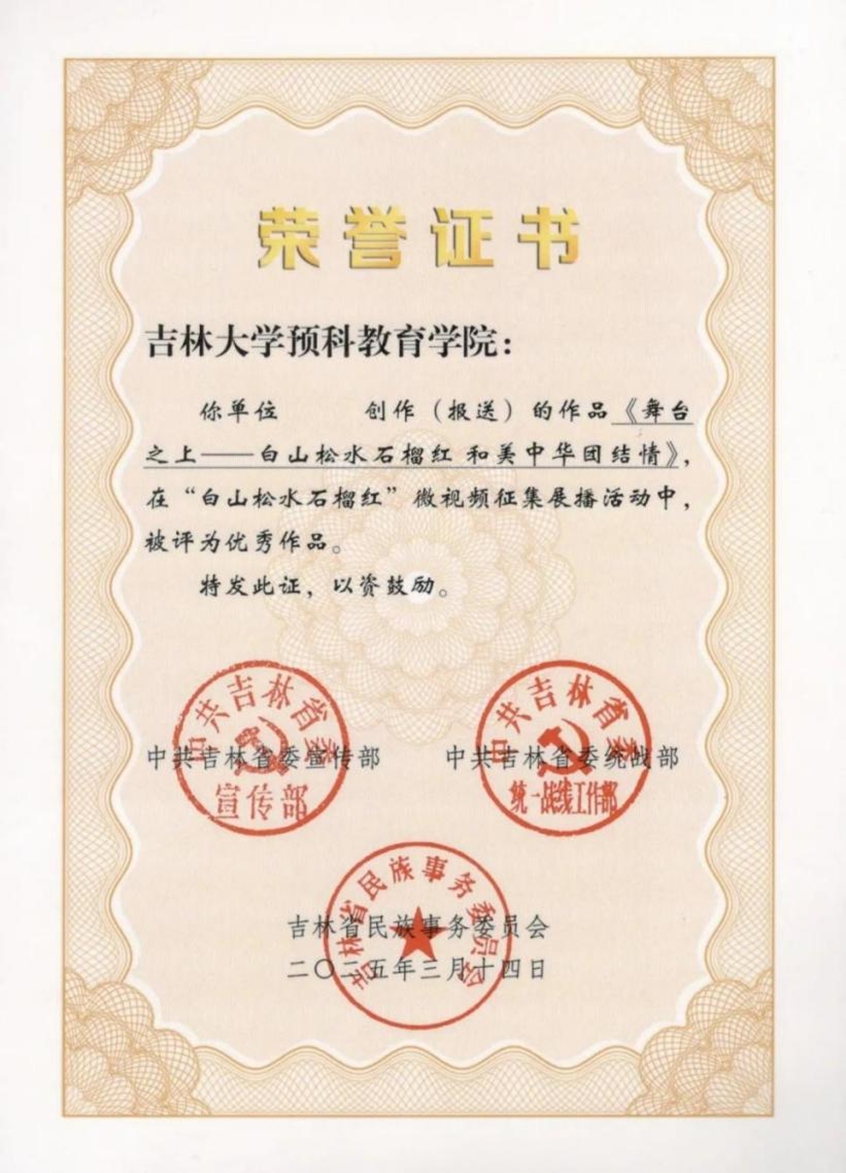 2025年7月,学院原创的微电影《舞台之上——白山松水石榴红和美中华团结情》在吉林省委宣传部、省委统战部、省民委联合举办的“白山松水石榴情”微视频征集展播活动中,获评优秀作品。