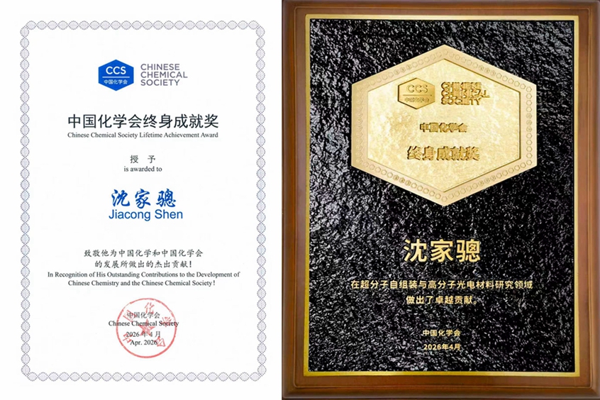 【供稿:超分子结构与材料全国重点实验室】4月11日至14日,中国化学会第35届学术年会在重庆市科学会堂举行。中国科学院院士、吉林大学化学学院沈家骢教授因在超分子自组装与高分子光电材料研究领域做出了卓越贡献,获颁第五届中国化学会终身成就奖。