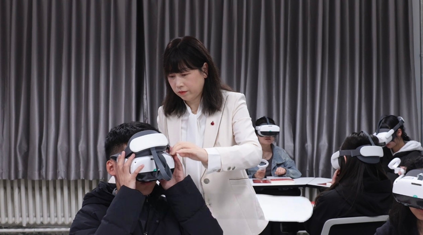 (赵娜在VR实训室指导学生沉浸式体验中华文明的起源与发展脉络,让铸牢中华民族共同体意识教育“活”起来)