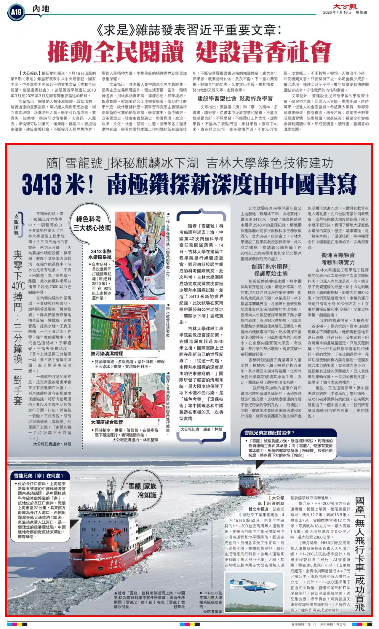 【消息来源:大公报】4月16日,香港《大公报》对吉林大学建设工程学院师生参与中国第42次南极科学考察并取得重要技术突破进行专题报道。报道以《3413米!南极钻探新深度由中国书写》为题,聚焦我校极地钻探关键核心技术创新成果。全文如下: