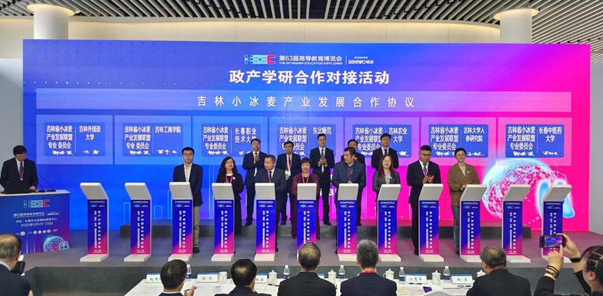 吉林大学基础医学院院长王放教授(右二)代表人参研究院与六家单位签署小冰麦产业协议