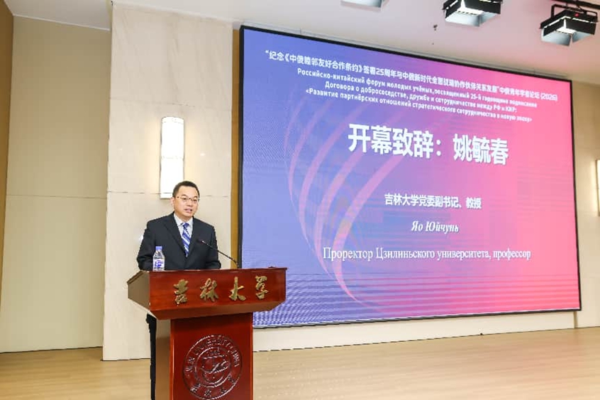 开幕式上,姚毓春代表校党委书记田辉、校长张希,对论坛的召开表示热烈祝贺,并向中俄两国嘉宾、学者及友好人士致以诚挚感谢。他指出,2026年是中俄确立全面战略协作伙伴关系30周年,也是《中俄睦邻友好合作条约》签署25周年。在两国领导人的共同引领下,中俄关系达到历史最高水平。吉林大学将以“中俄教育年”为契机,持续深化对俄合作,助力中俄睦邻友好不断向前发展。他勉励两国青年学者通过论坛深入交流、凝聚共识,产出更多高水平成果。