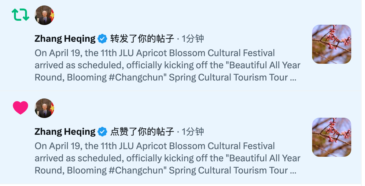 吉林大学杏花文化节获中国驻巴基斯坦大使馆文化参赞、巴基斯坦中国文化中心主任转推、点赞 2026-04-20